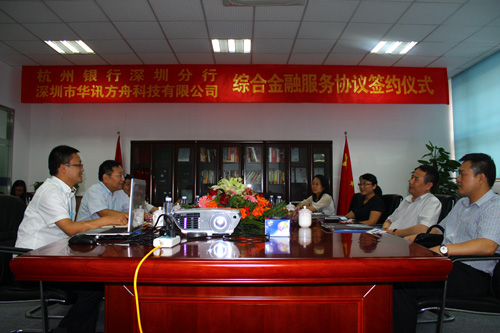 7月25日,杭州銀行深圳分行與華訊方舟的綜合金融服務協議簽約儀式在集團總部舉行,杭州銀行深圳分行行長冷文廣及其代表,華訊方舟總裁黃永江、副總裁Sunny等領導共同出席了簽